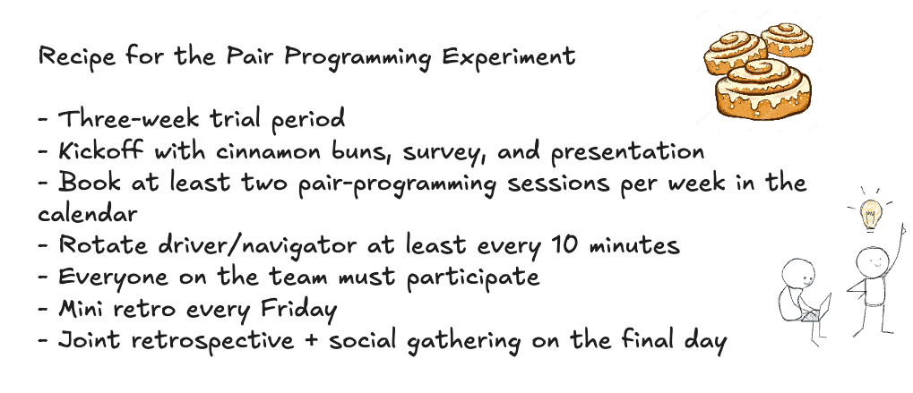 - Developers book two pair-programming sessions per week (in their calendars) during the trial period